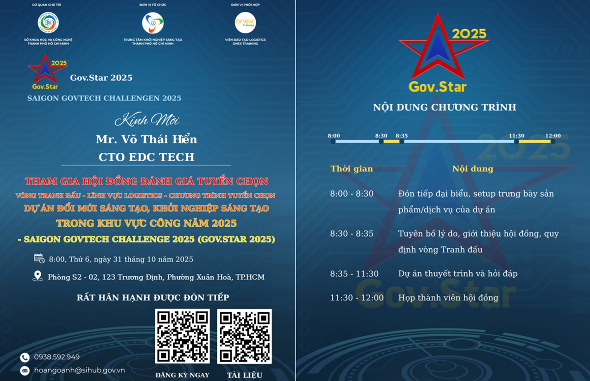 Saigon Govtech Challenge 2025 “Gov.Star 2025” là chương trình tuyển chọn dự án đổi mới sáng tạo, khởi nghiệp sáng tạo trong khu vực công, tập trung vào lĩnh vực Y tế và Logistics. Chương trình do Sở Khoa học và Công nghệ là cơ quan chủ trì, Trung tâm Khởi nghiệp sáng tạo Thành phố Hồ Chí Minh là đơn vị thực hiện.
