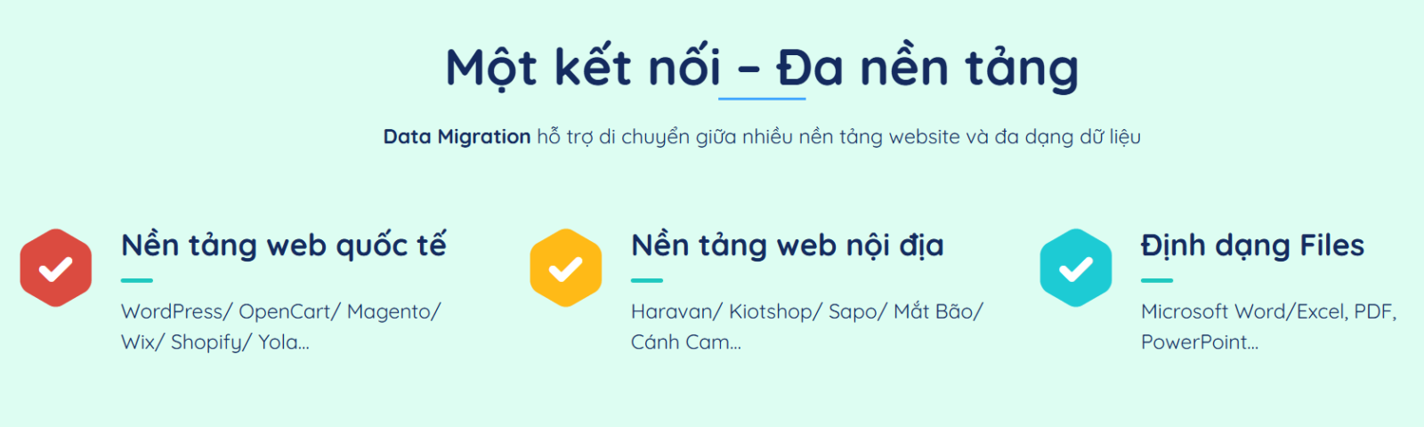 Hầu hết các nền tảng phổ biến hiện nay như: WordPress, Shopify, WooCommerce, Haravan, Wix, Sapo, KiotViet,… Data Migration đều tương thích nên vô cùng phù hợp cho các doanh nghiệp đa kênh hay doanh nghiệp đang tái cấu trúc hệ thống.