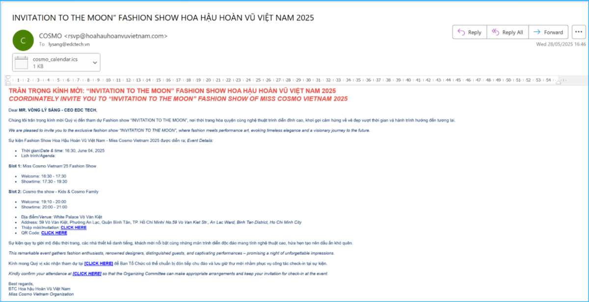 Mỗi chiến dịch email đều được gửi từ chính tên miền email của BTC (2 bên cùng phối hợp cấu hình Email Server) đảm bảo sự tin cậy và tăng khả năng tương tác. Nội dung email có thể cá nhân hóa linh hoạt: Tên, Chức vụ, Công ty, Mã QR, Hình đại diện… phù hợp với từng Khách mời, từng mục tiêu và từng kịch bản của sự kiện.